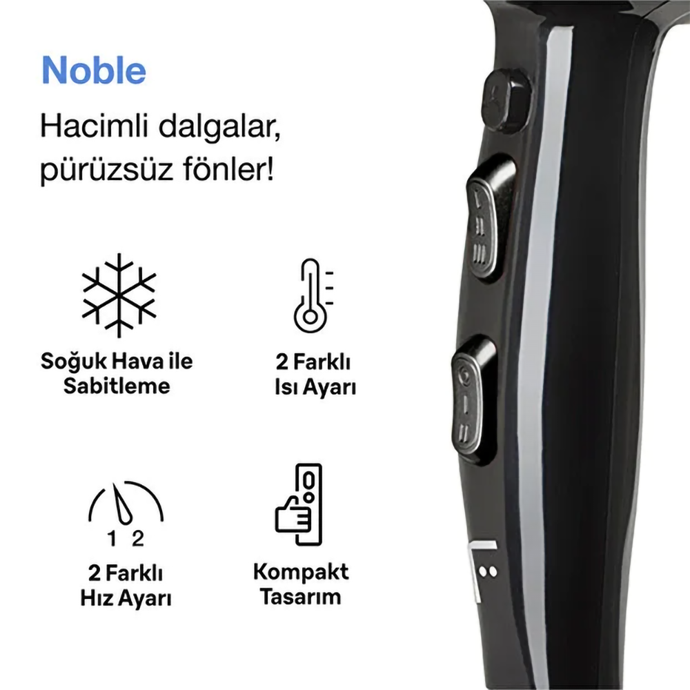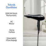 2200W Güçlü AC Motor 2 Kademeli Hız Ayarı 3 Kademeli Isı Ayarı Soğuk Hava Fonksiyonu Difüzör ve Dar Başlık Asma Kancası